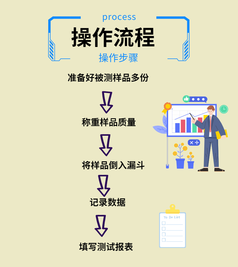 堆積密度測定儀是用于評價粉體工藝性能的方法,因測試的樣品差異,采用漏斗方法,不同的樣品流動性不一樣,故在漏斗出口孔徑數的選擇也應該滿足物料自然流動的要求.